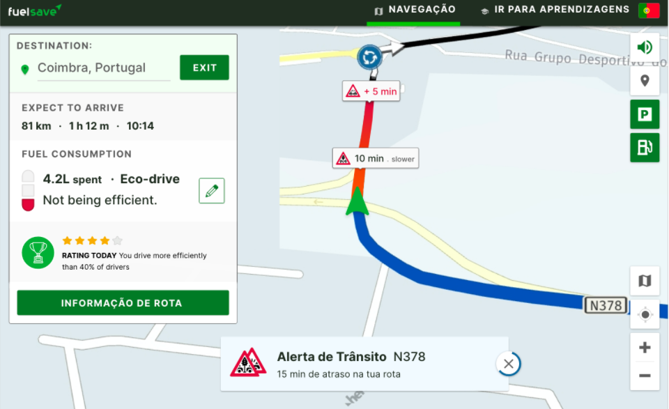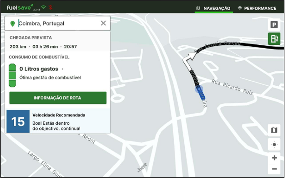 Assim, criamos então uma interface para o motorista que o informa sobre oportunidades para aumenta a sua performance e assim reduzir o consumo de combustível. Tendo como suporte uma navegação-GPS apropriada a veículos pesados, são fornecidas indicações sobre como otimizar o consumo de combustível tendo em consideração os mais variados cenários e fazendo com que se chegue ao destino dentro dos prazos estabelecidos.