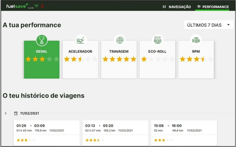 O motorista pode também consultar o histórico das suas viagens e analisar os pontos de melhoria para que consiga consistentemente aumentar a sua performance e assim a rentabilidade do negócio.
